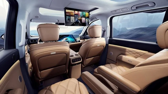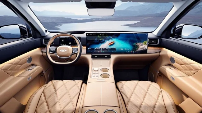 Если внешность Fulwin T11 уже не секрет, то интерьер вседорожника продемонстрировали впервые. Внимание внутри сразу же привлекает огромный 30-дюймовый 6K-экран на передней панели, с которым соседствует компактная цифровая приборка. Кнопок на торпедо дизайнеры не оставили, но несколько переключателей можно заметить на центральной консоли. Логично предположить, что на них завязан выбор режимов движения, а также включение аварийки. Ещё один 17.3-дюймовый дисплей положен задним пассажирам. Его разместили на потолке.