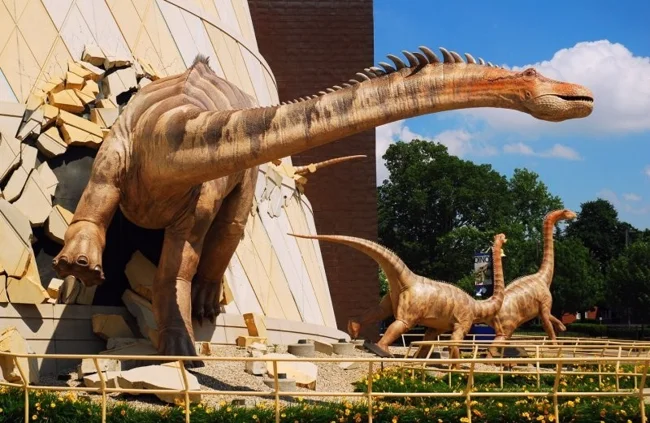 В Детском музее Индианаполиса поселились необычные экспонаты. Эта остроумная инсталляция соединяет доисторических гигантов с современными реалиями.