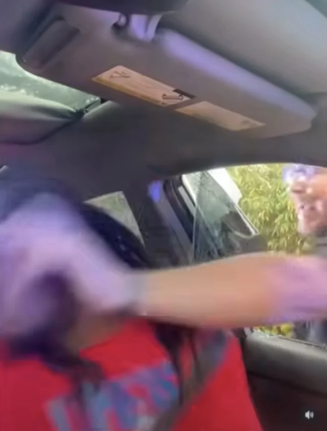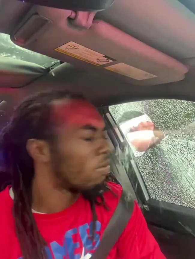 Полицейский, стоящий у водительской двери, разбивает стекло кулаком. Он кричит: «Немедленно выйдите из машины». И тут же бьёт водителя по голове.