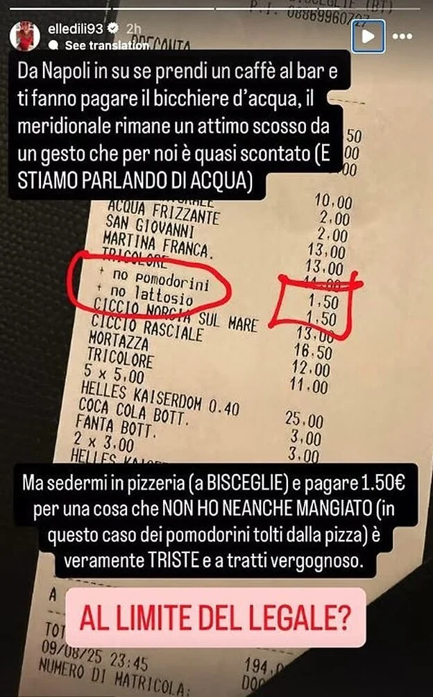 Она добавила к фотографии счета подпись: «В любой точке к северу от Неаполя вам придётся платить за воду для кофе. Люди, родившиеся на юге, поражены этим, ведь очевидно, что мы не должны платить за воду».