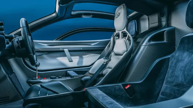 В салоне в сравнении с донорским GMA T.50 стало ещё больше углепластика. Переделаны рулевое колесо, приборная панель (сами приборы примерно те же), дверные карты.