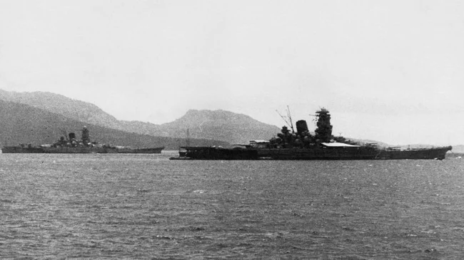 Японские линкоры IJN Musashi и IJN Yamato на рейде японской военно-морской и авиационной базы на островах Трук, архипелаг Каролинские острова