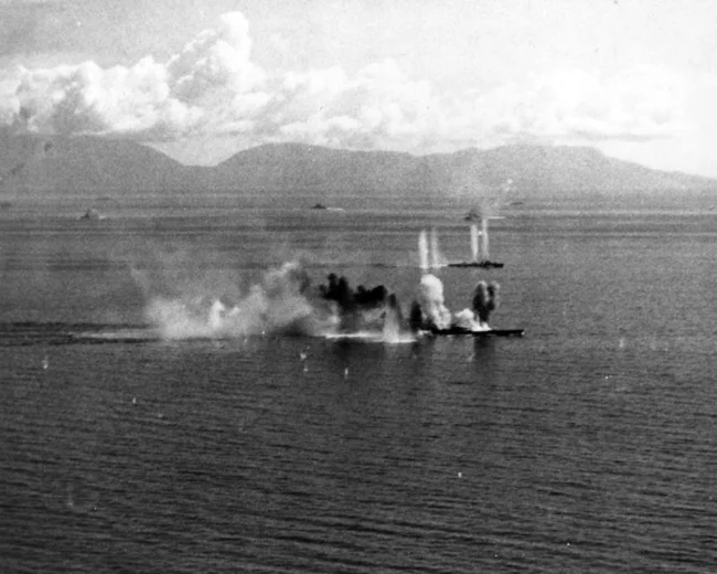 Американские палубные самолеты 38-го оперативного соединения атакуют линкор IJN Musashi, окружённый разрывами. Потери американцев составили 18 самолётов из 259 участвовавших в атаках