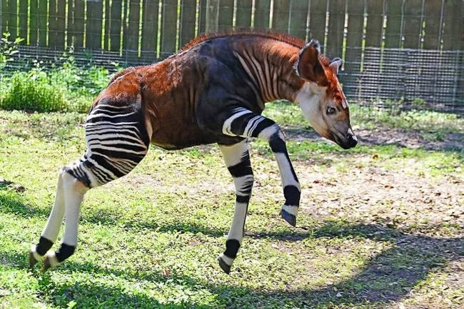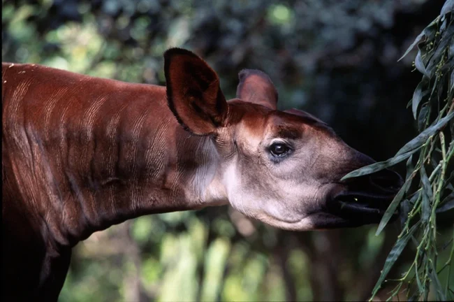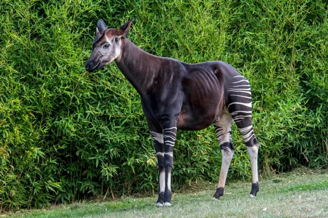 В яркий солнечнй день коричневая шкура и полоски маскируют окапи на 5 с плюсом.