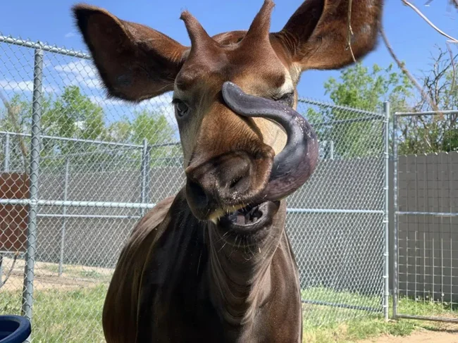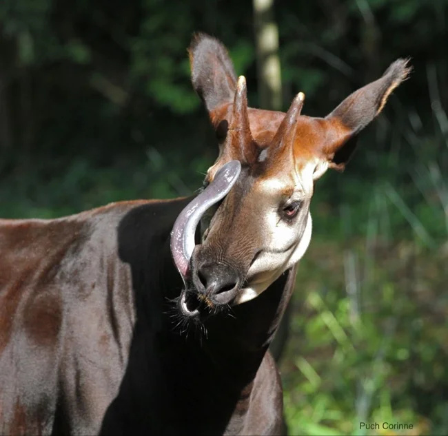 Интересной особенностью окапи является длинный, жесткий, чёрный и очень подвижный язык. Это натуральная рука, способная самостоятельно срывать листья и очень эффективно чистить морду зверя.