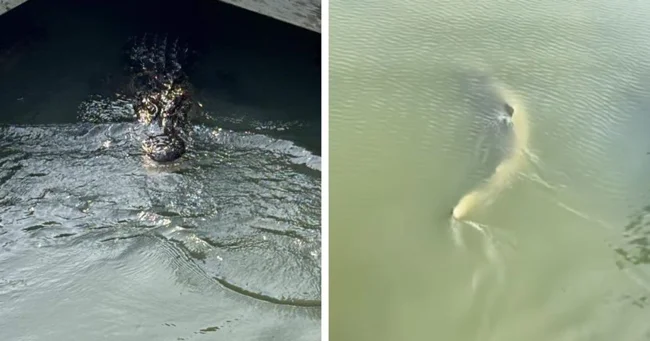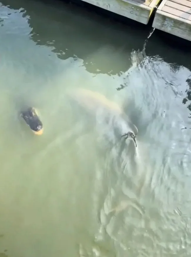 Джина Атанс, уроженка Чикаго, приехала на отдых, когда стала свидетелем непривычного зрелища. Аллигатор плыл вдоль причала, когда к нему приблизилась лимонная акула.