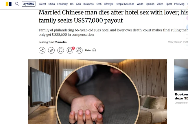 Представьте ситуацию: вы в разгар страстной встречи с любовницей в уютном отеле, и вдруг — бац, сердце не выдерживает. Именно так закончилась жизнь 66-летнего китайца по имени Чжоу, который словил острый инфаркт миокарда прямо во время секса.
