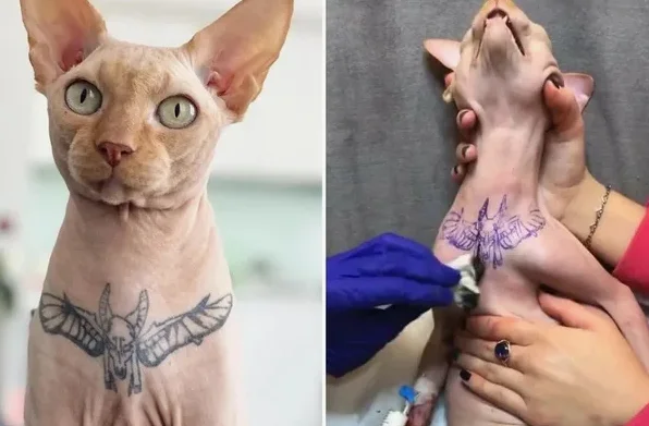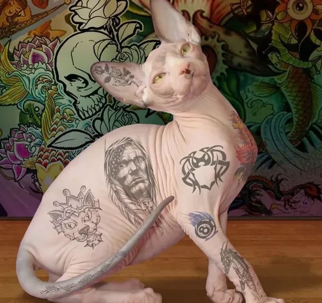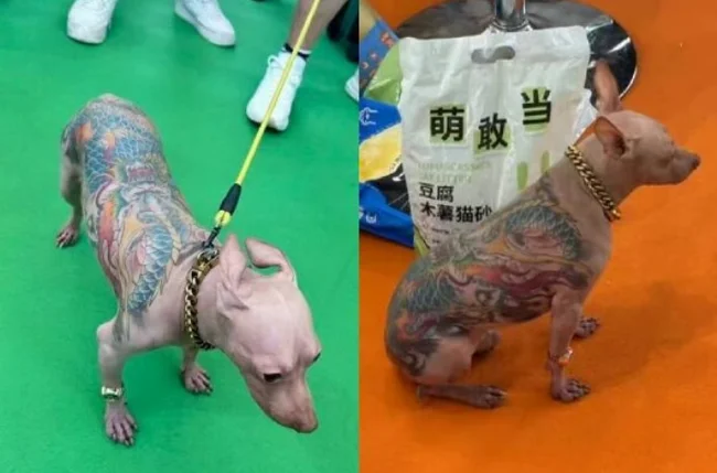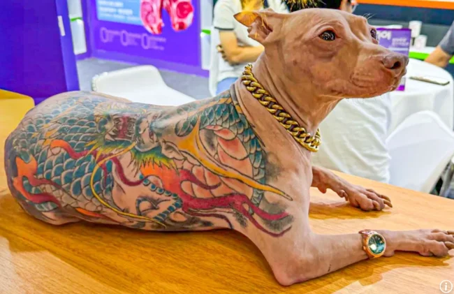 Выставка в Шанхае – одно из крупнейших мероприятий индустрии домашних животных в Азии. И на нем была мексиканская голая собака, возраст которой не разглашается, покрытая большими яркими татуировками. У нее была сложная татуировка дракона простирающаяся от спины до верхних конечностей. На собаке также была золотая цепочка и наручные часы.