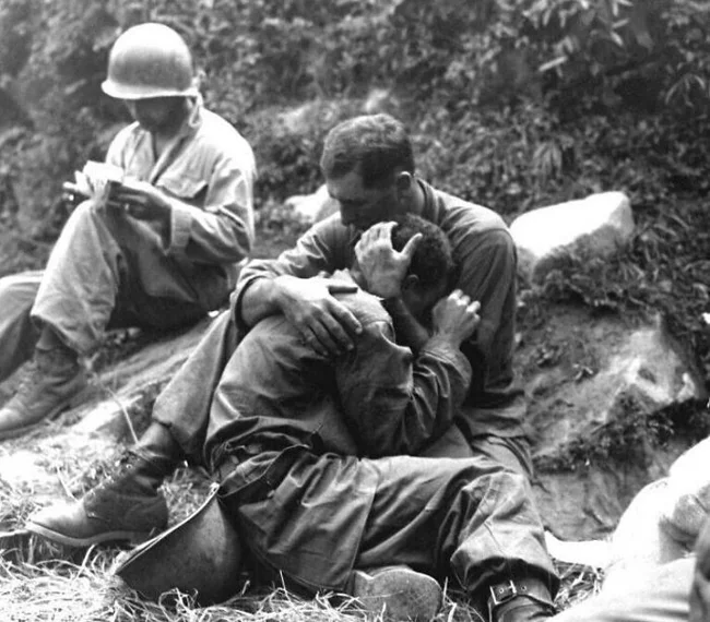 15. Американский солдат плачет из-за гибели своего друга в бою, Хактонни, Корея, 28 августа 1950 года