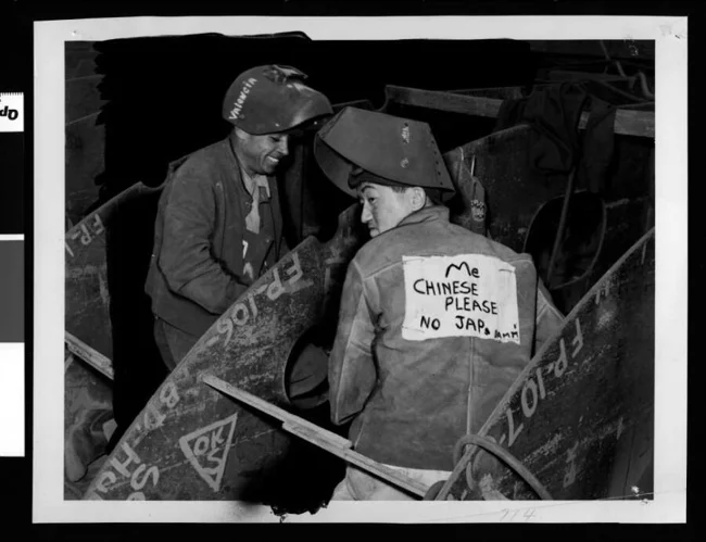 24. Рабочий на фабрике в Калифорнии с табличкой на спине: «Я китаец, пожалуйста, никаких японцев». США, 1942 год, после нападения на Перл-Харбор.