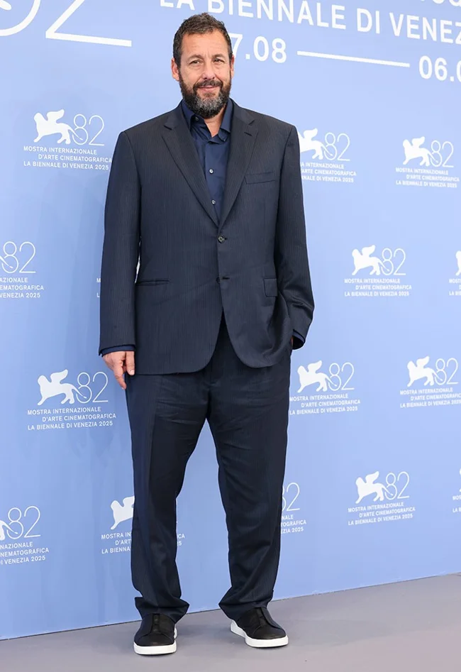 Сэндлер сменил свой фирменный повседневный наряд на чёрный костюм в сочетании с тёмно-синей рубашкой и кроссовками.