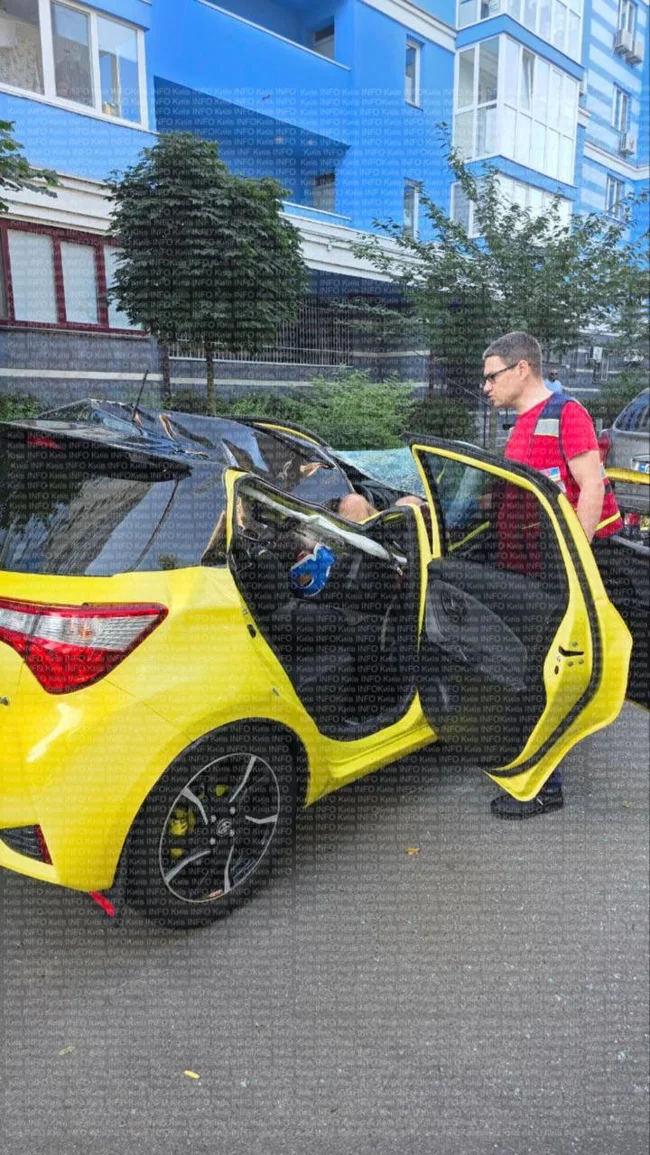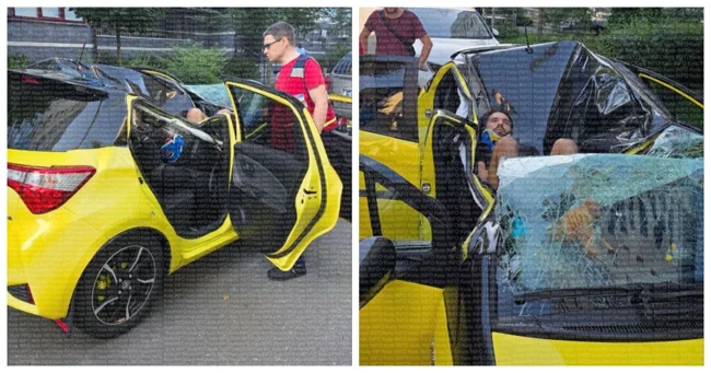 На фото можно увидеть, как молодой человек лежит в авто, упав с большой высоты и сломав крышу машины. Изображения показывают, что на мужчине находится фиксатор шеи, характерный для лиц, получивших серьезные травмы позвоночника.