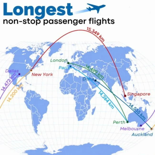 Самый длинный регулярный беспосадочный рейс (Сингапур – Нью-Йорк, 17 250 километров) покрывает такое огромное расстояние, что пилоты могут сами выбирать, как лететь обратно: на запад через Тихий океан или на восток через Атлантику и Европу. Выбор зависит от высотных ветров, что позволяет экономить время и топливо.