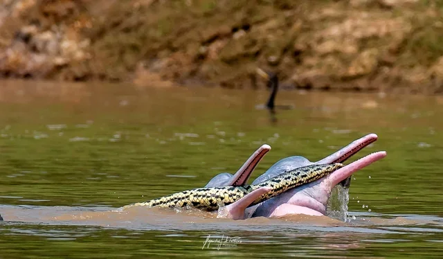 Так боту стал высшим хищником Амазонки. Среди всех дельфинов у речного — самый разнообразный рацион: в него входит более 50 видов рыб, амфибий и рептилий! За день иния съедает около 5% от собственного веса. Это от 7,5 до 10 кг!