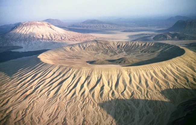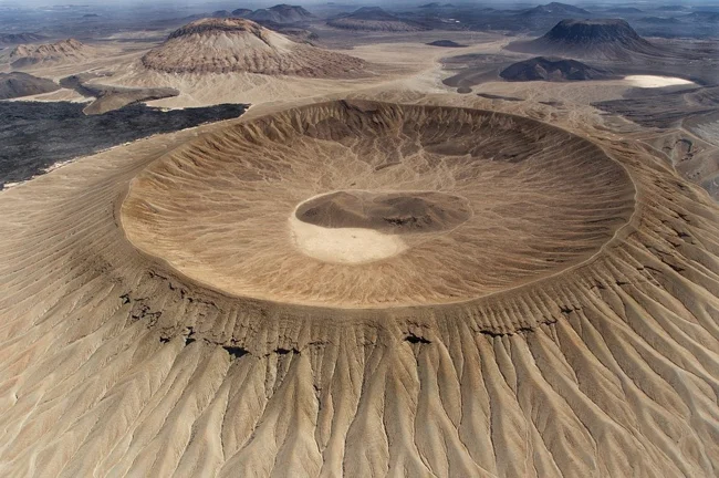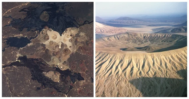 Симметричные структуры на фотографии из космоса — это туфовые конусы. Они образуются, когда извержение лавы происходит в присутствии воды. Это сочетание создаёт влажные, липкие пирокластические отложения, способные сформировать крутой конус, особенно если они затвердевают быстро. Наличие этих конусов указывает на то, что в периоды вулканической активности местный климат был значительно более влажным. Сегодня этот регион абсолютно сухой, с ничтожным количеством осадков в год, что объясняет почти полное отсутствие здесь какой-либо растительности.