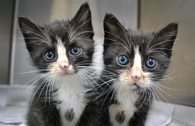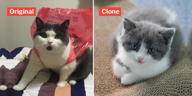 Это первый клонированный котёнок из Китая по кличке Чеснок. Слева — донор, справа — клон.