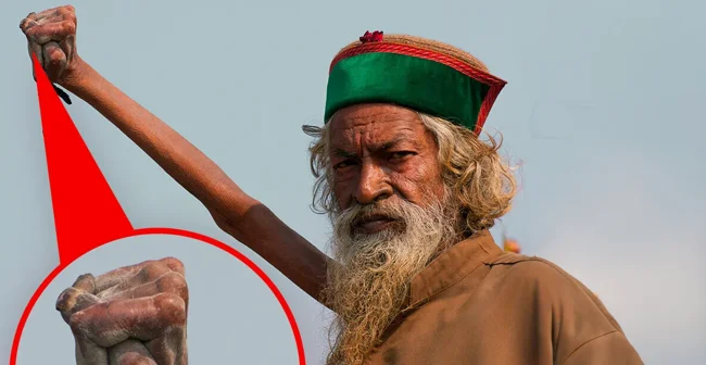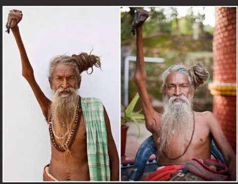 Вот уже более 14 лет индийский монах-садху держит руку в поднятом положении в знак уважения к своему богу. Говорят, садху и спят вертикально, так что даже спать на бок он не ложится.