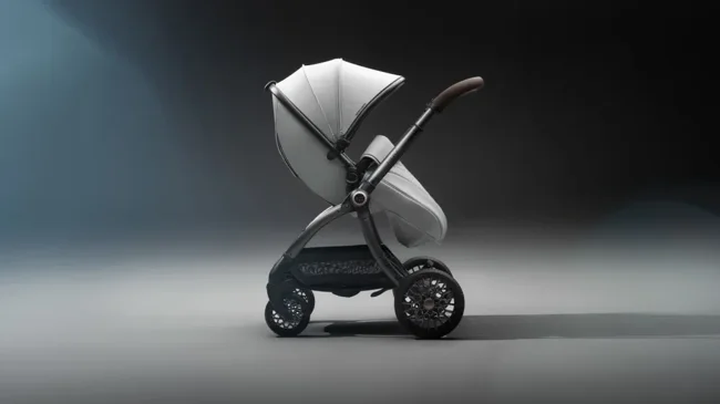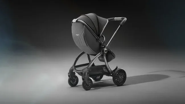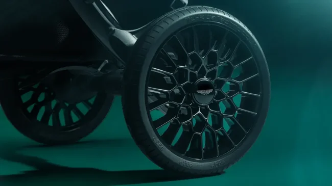 Рисунок колёс колясок отсылает к дискам, применяемым на эксклюзивных Aston Martin Valour и Victor, а их ступицы должны напоминать оформление поворотных переключателей на центральных консолях автомобилей. Строчка, которой соединяются детали чехлов, скопирована с отделки интерьера кроссовера DBX707. Кроме того, её узор продублирован в рельефе некоторых жёстких деталей.