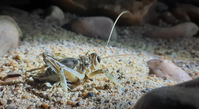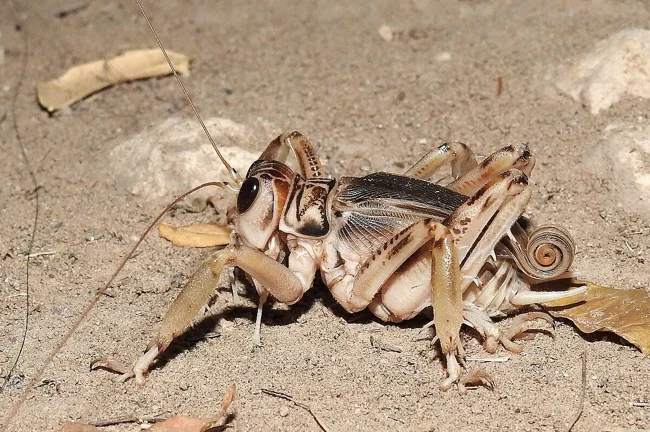 Дюнные сверчки вырастают достаточно крупными, чтобы напугать инсектофоба, но недостаточно крупными, чтобы его съесть. Тело взрослого сверчка длиной примерно 4-5 сантиметров. Если вытянуть его мощные лапки с лопастевидными расширениями, то эту длину можно удвоить. А если посчитать вместе с усами, то суммарная длина взрослого насекомого достигнет 20 сантиметров.