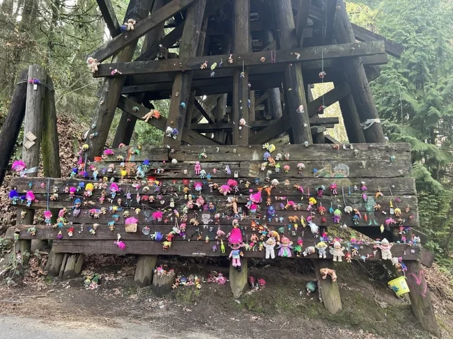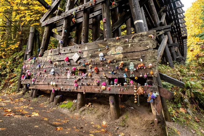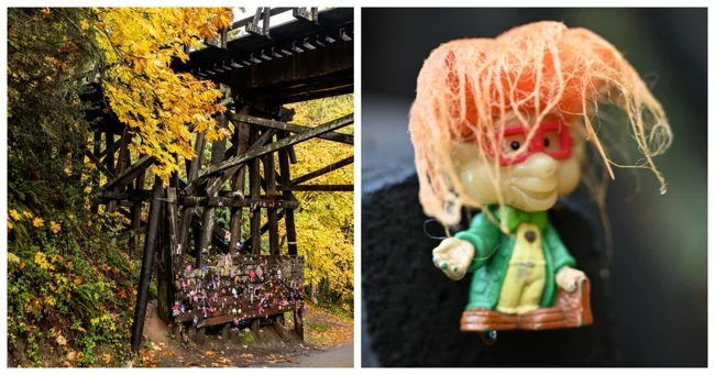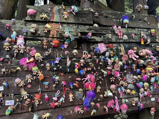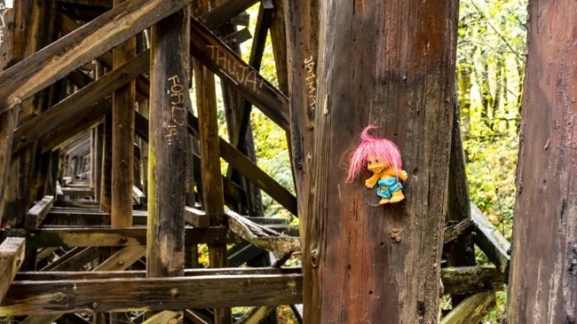 Именно этих красочных маленьких троллей путешественники и обнаруживают под старым железнодорожным мостом на окраине Портленда. Здесь, на ряде потрёпанных временем деревянных балок, вы и увидите троллей.