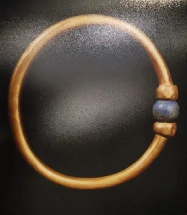 Украшение изготовлено из золота и украшено бусиной из лазурита — некогда редкого драгоценного камня глубокого синего цвета, часто с золотыми вкраплениями.