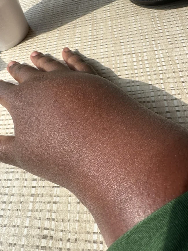 Большой синяк на руке через два дня после тренировочной внутривенной инъекции