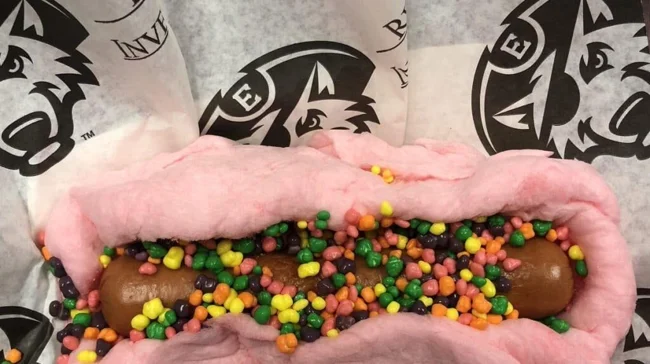 Там жарят во фритюре всё, что можно и нельзя. А также сочетают несочетаемое. Как, например, этот хот-дог, где вместо булочки сахарная вата, а вместо кетчупа кондитерская крошка.