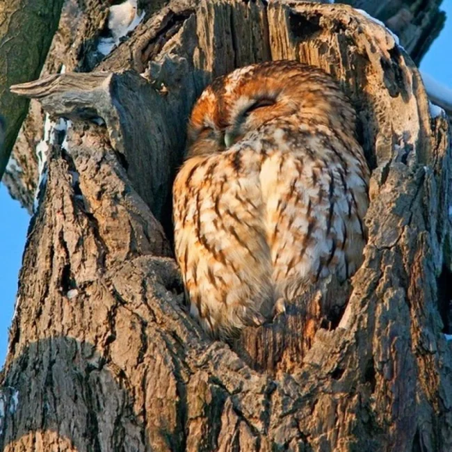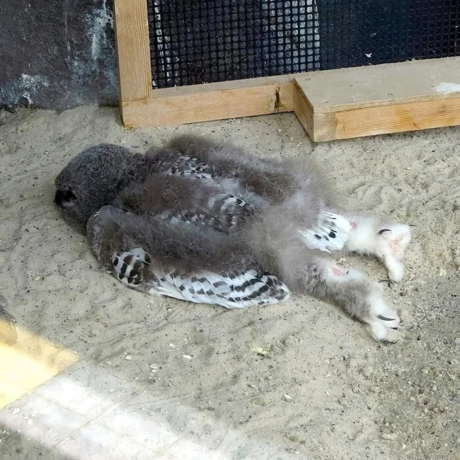 Обычно взрослые совы спят сидя. Связки на их лапах устроены так, что они могут отдыхать почти без затрат энергии. Но в гнезде даже взрослые пернатые могут прилечь по-настоящему.