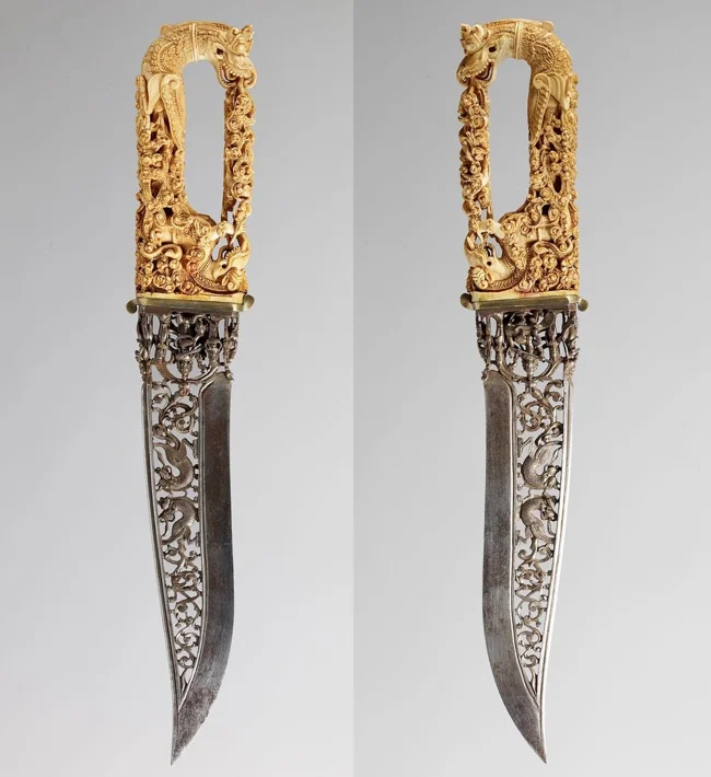 Кинжал с ажурным клинком и рукоятью из резной слоновой кости, украшенной изображениями индуистских божеств. Мадурай, Индия, 1600–1645 годы.