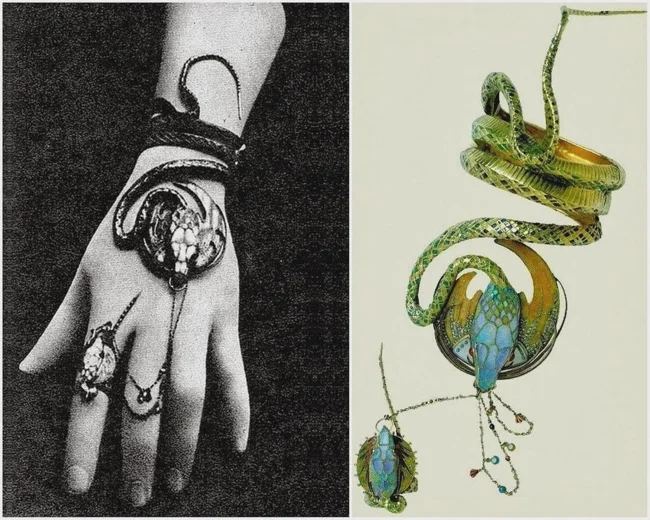Браслет в форме змеи с кольцом, созданный чешским художником Альфонсом Мухой для французской актрисы Сары Бернар. Изготовлен в технике перегородчатой эмали с рубинами, опалами и бриллиантами. 1899 год.