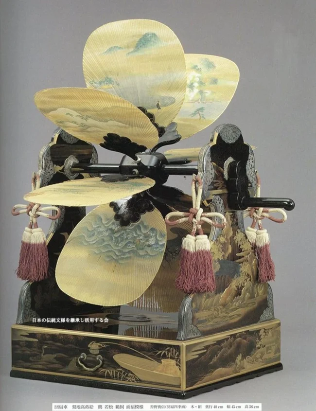 Веерное колесо (утива-гурума), принадлежавшая японской императорской семье и изготовленная в конце периода Эдо. Основание выполнено из лакированного дерева с гранатовым узором, а роспись на веере создана Кано Осанобу (1796–1846 годы).