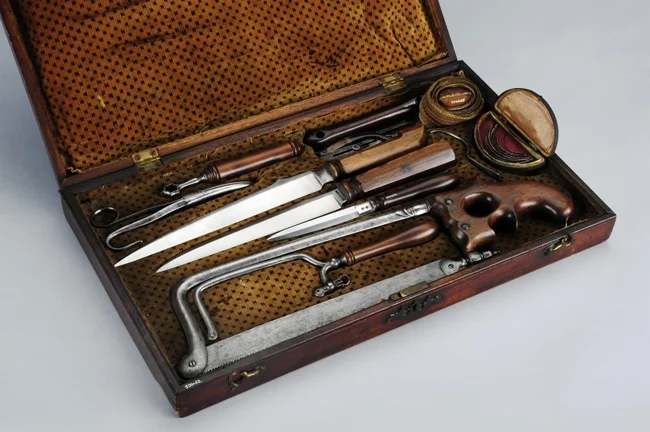 Набор для ампутаций в деревянном футляре, включающий пилы, скальпели и жгут. Шотландия, около 1750–1800 годов.