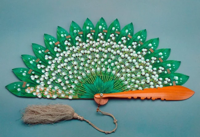 Складной веер императрицы Марии Фёдоровны, украшенный изображением ландышей. Веер изготовлен из дерева и шёлка, а резные и расписные элементы с ювелирной точностью воспроизводят цветы и листья растения. 1870–1890 годы, хранится в Эрмитаже в Санкт-Петербурге.