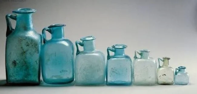 Семь римских стеклянных сосудов синего цвета, использовавшихся для измерения объёма. Каждый последующий сосуд имеет вдвое больший объём, чем предыдущий. Артефакты датируются первым веком нашей эры, найдены в Помпеях, Италия.