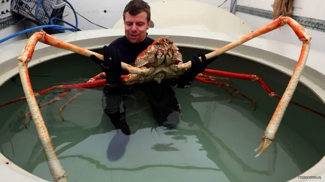 Итак, глубина 300 метров. Сумеречная зона — лучи солнца всё еще пробивают поверхность воды, до тотальной беспросветности ещё далеко. Но уже здесь привычные морские обитатели принимают сюрреалистичные формы. Японский краб-паук — крупнейшее членистоногое на планете. Размах их лап достигает до 3 метров!