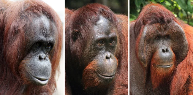 Самки-орангутаны куда меньше: всего 115 сантиметров и 40 килограмм. Мордочка у них тоже аккуратная и милая, без всяких лишних деталей. Но, как недавно выяснилось, среди орангутанов живёт ещё один «вид» самцов.