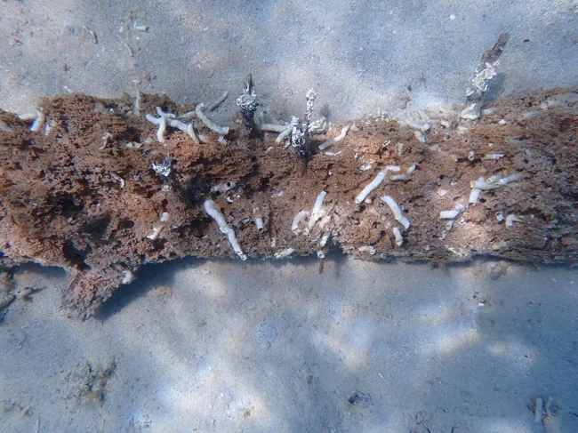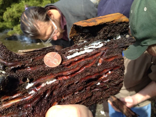 Вот эти белые штуки — не сами черви, а их известняковые "домики" внутри древесины.