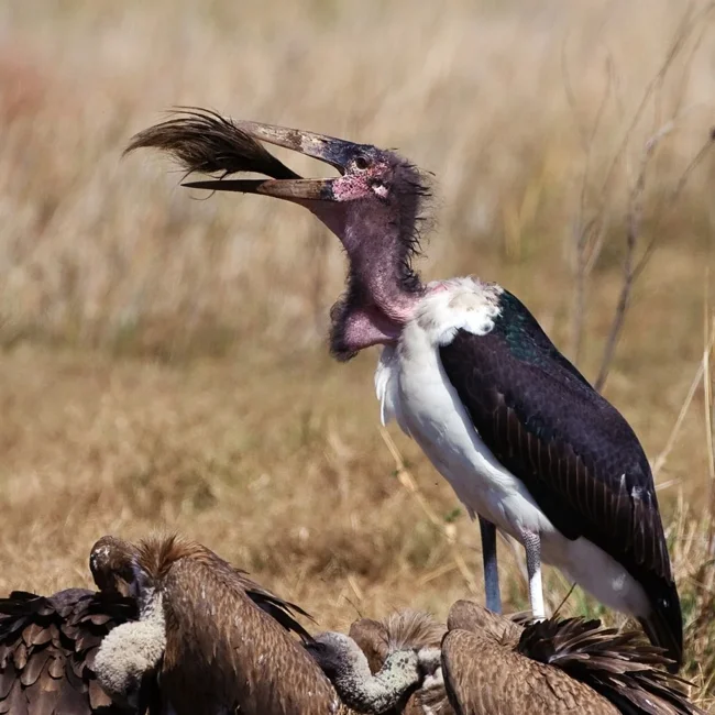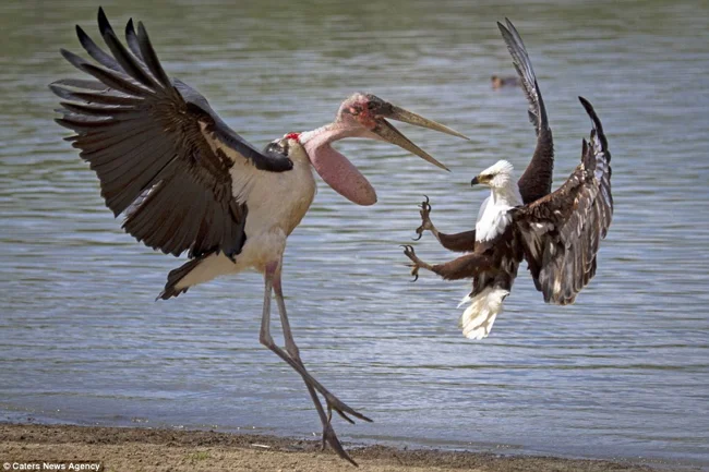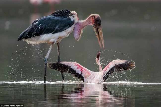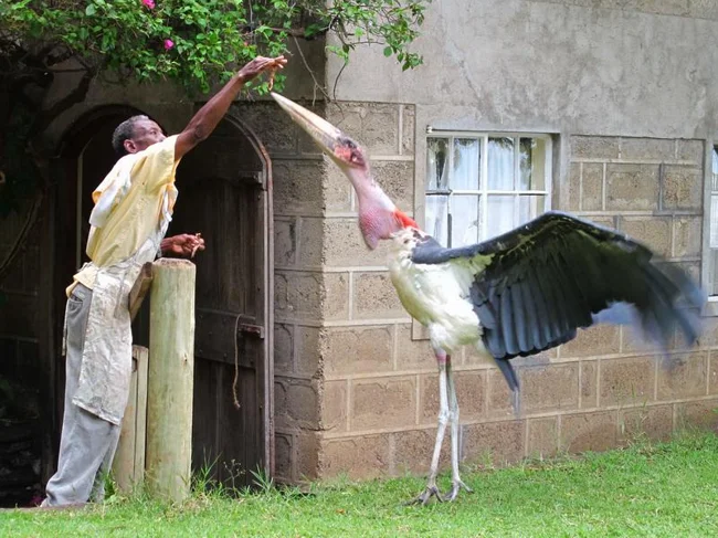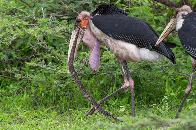 Марабу пользуются своими размерами. Часто они воруют и отбирают добычу у более мелких птиц.