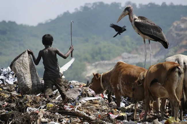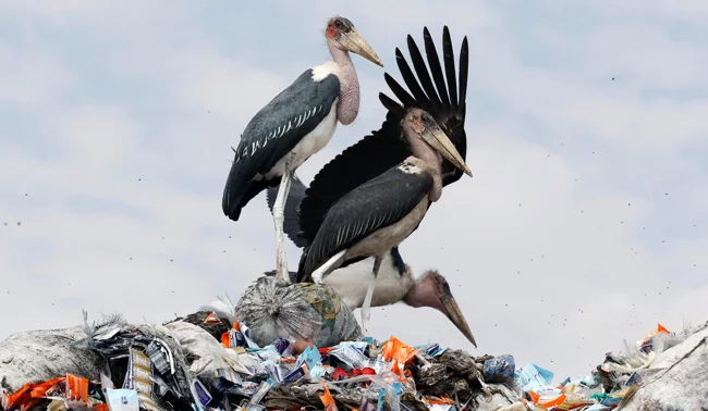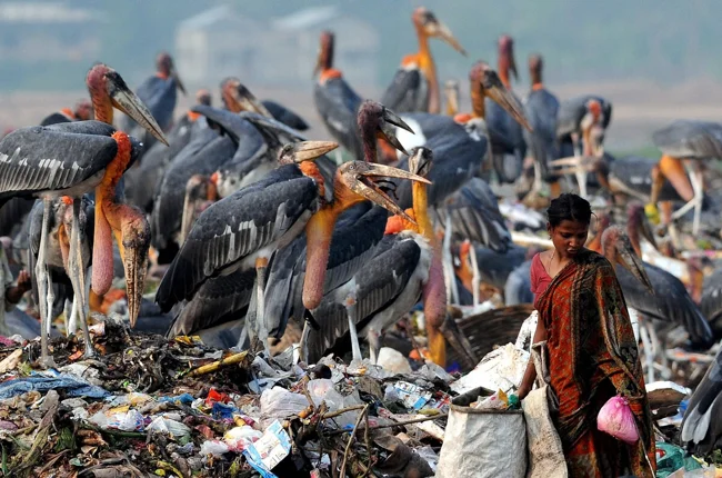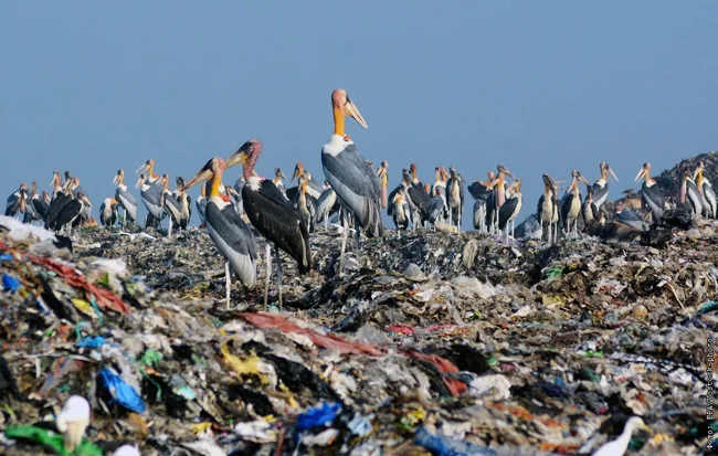А вот в Индии, Бангладеше, Непале и Камбодже падальщики переселились ближе к городам, на гигантские свалки мусора. Марабу привлекает «лёгкая еда» на помойке, однако, как показывают исследования, не такая уж она и лёгкая. Среди отходов птицам чаще всего попадаются растительные остатки и человеческая еда, которая по сравнению с мясом, пусть и тухлым, куда менее калорийная. Поэтому птицам приходится проводить больше времени в поиске пропитания. Плюс такой рацион богат всевозможными консервантами, пестицидами и прочими химическими веществами, от которых у марабу нет никакой защиты. Так, популяция индийского марабу сегодня находится на грани исчезновения.