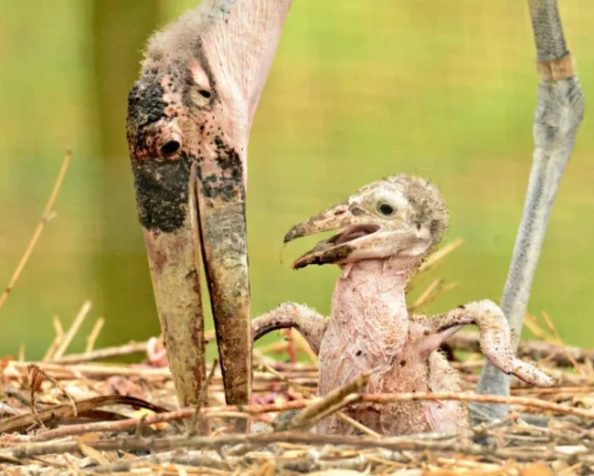 В природе родители-марабу старательно вкладываются в потомство. Самка откладывает 1-3 яйца в большое гнездо из веток и перьев и высиживает их около месяца. А после, несмотря на свою приверженность падали, и мать, и отец охотятся на живую добычу. Первое время птенцы питаются исключительно свежим мясом — малыши пока не могут переваривать тяжёлую протухшую пищу.