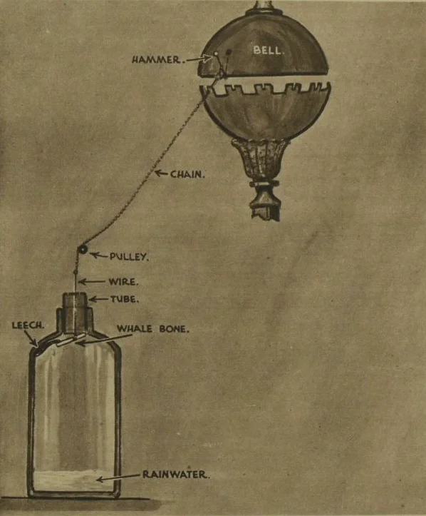 При приближении шторма изменение атмосферного давления заставляло пиявок подниматься в узкое горлышко. Своими движениями они сдвигали китовый ус, что приводило в действие механизм, и колокол звенел. Если несколько колокольчиков звонили один за другим, это и означало, что буря предсказана.
