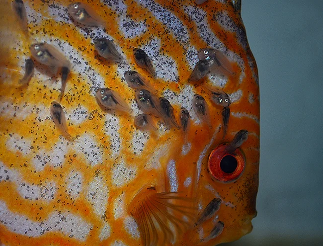 Все рыбы выделяют слизь, покрывающую их тело. Слизь улучшает гидродинамику и защищает кожу от паразитов и грибков. Но когда у парочки дискусов вылупляются мальки, у обоих усиливается синтез гормона пролактина. А он, в свою очередь, мотивирует клетки эпидермиса работать за троих и выделять больше слизи.