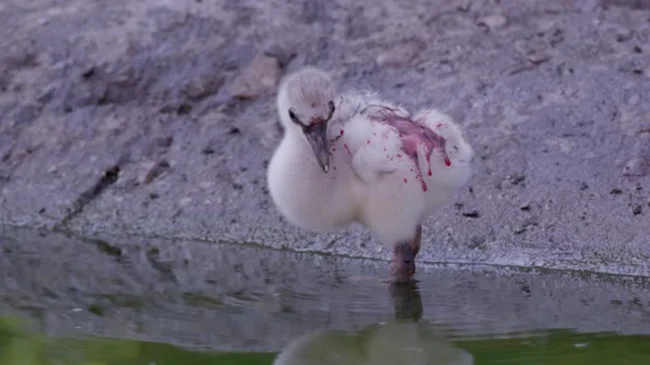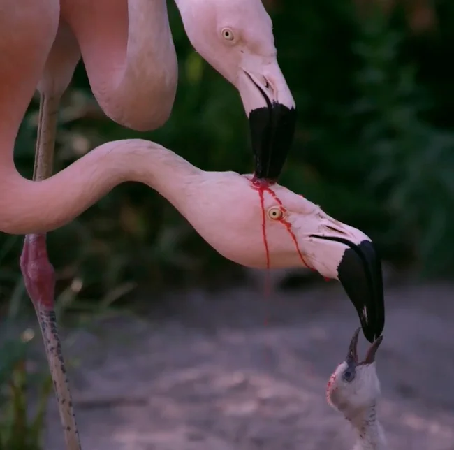 Но у фламинго кормление выглядит не только мерзко, но и откровенно жутко. Ведь их зобное молочко по цвету как свежая кровь. И когда оно вытекает из клюва жадно лакающего птенца, дурно может стать даже человеку с крепким желудком. Но на самом деле его состав вполне обычен, а цвет столь странен из-за раскраски панцирей рачков, которыми фламинго питаются.