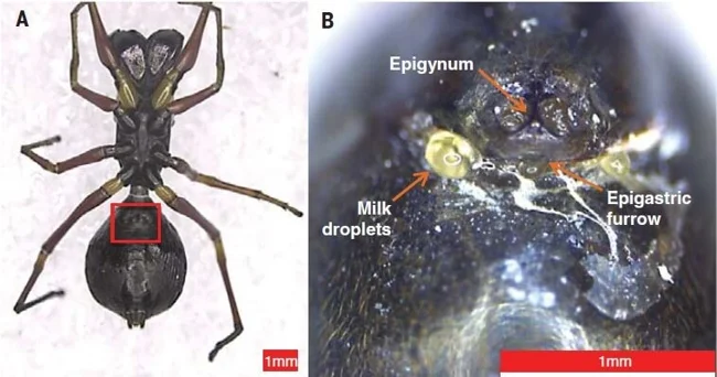 В процессе наблюдения исследователи натолкнулись на нарушение закона сохранения материи: самка питалась за пределами гнезда и пропитание домой не носила, но за 20 дней паучата выросли почти втрое! Установив камеры прямо над гнездом, арахнологи обнаружили, что самки оставляют в гнезде капельки вязкой белёсой жидкости. А паучки высасывают их по мере необходимости.
