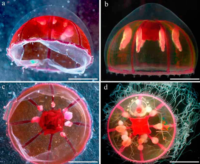 Казалось бы, вот уж кто точно не должен кормить своё потомство, так это медузы. У них даже нет центрального нервного узла, им просто нечем думать и заботиться! Однако, известен по крайней мере 1 вид из рода трахимедуз, чьё потомство при вылуплении не уплывает прочь, а стремится спрятаться под купол мамы. Ведь там не только безопасно, но и вкусно! Эпидермис матери на внутренней стороне купола выделяет жёлтые жировые капельки, которыми потомство и питается первое время.