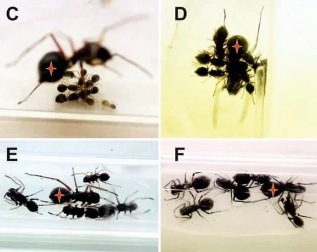 Потомство (под куполом матери на фотографии d) имеет жёлтоватый оттенок тела как раз потому, что оно питается мамиными жирами.