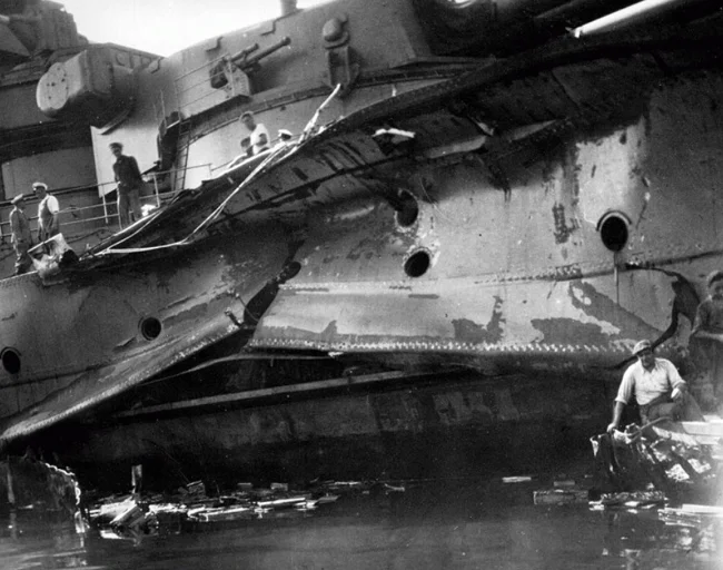 Это попадание привело к детонации 14 стокилограммовых глубинных бомб. Сильнейшая ударная волна проделала в линкоре пробоину 18 на 12 метров. От корпуса оторвались бронеплиты, некоторые отсеки затопило, появился лёгкий крен. Dunkerque принял 20000 тонн воды и опустился на грунт. Он вышел из строя на многие месяцы. Два линкора, несколько эсминцев и вспомогательных кораблей получили серьёзные повреждения.