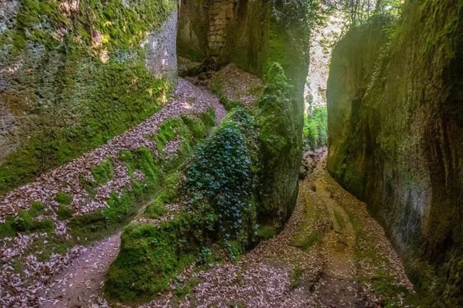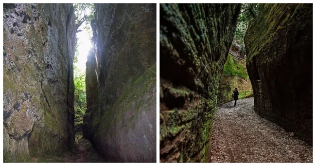 Эти коридоры, больше похожие на узкие каньоны, поднимаются к небу двадцатиметровыми каменными стенами. Одни пути ведут к забытым некрополям и гробницам, другие устремляются прямиком к сказочным городам Сована, Сорано и Питильяно, а от них к окрестным полям и ручьям. Всюду на поверхности скал заметны следы резцов, свидетельствующие о титаническом труде создателей. Но истинная цель их работы навсегда скрыта в глубине веков.