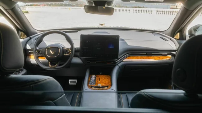 Внешне 900 LX отличается от базовой модели VF 9 благодаря хромированной радиаторной решетке, золотым деталям на дверных ручках и капоту, а также элементам роскоши в салоне, включая кожаные и деревянные вставки.