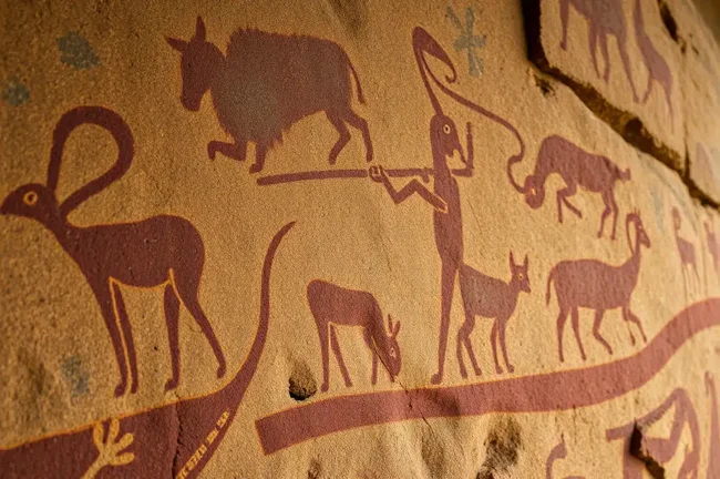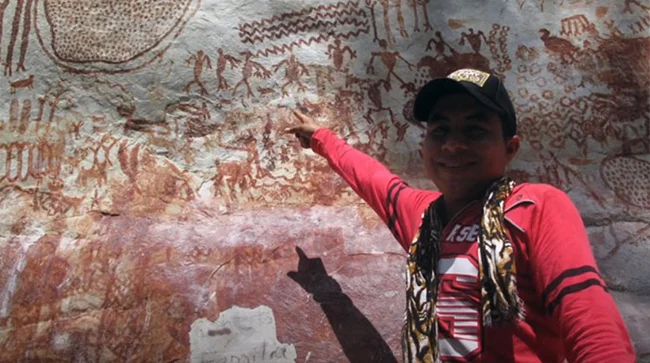 Во-вторых, “есть разнообразие картин”, сказал он. “Из водной среды обитания встречаются рыбы, черепахи, анаконды, удавы. Но есть и птицы, такие как орлы и королевский стервятник. Затем о наземных животных: обезьянах, оленях, гигантских ленивцах и лошадях.” Здесь также присутствуют абстрактные образы и изображения тонко прорисованных фигур, в том числе танцовщицы в середине поворота.